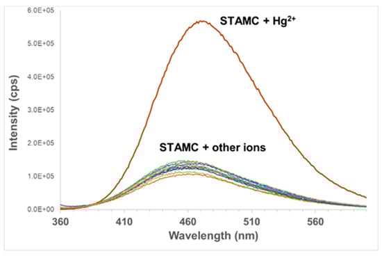 The selectivity of STAMC for Hg2+ was studied in H2O/MeCN (7:3, v/v). Different heavy metal, transition metal, alkali earth, and alkali ions including Cd2+, Pb2+, Cu2+, Ni2+, Zn2+, Ca2+, Mg2+, Co2+, Cr3+, Mn2+, Fe3+, Al3+, Ag+, and Na+ were used for the investigation. The concentration of all the metal ions was fixed at 50 µM (1 equiv) where only Hg2+ caused a dramatic change in the fluorescence intensity, indicating that STAMC is highly selective for the detection of Hg2+ (Figure 6), which is a matter of necessity for an excellent chemosensor.