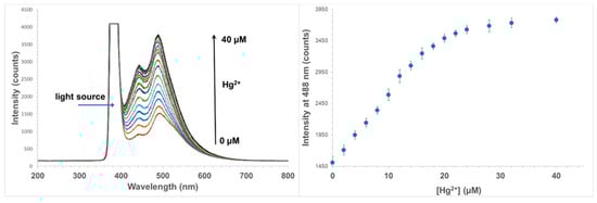 Response of the sensor to Hg2+ in the concentration range from 0 to 40 µM in H2O (left). Titration plot at 488 nm (right).