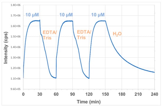 Sensor reusability is important for the development of a tool that can allow multiple, rapid and real-time measurements in the field. Consequently, a range of known mercury binders and washing agents were screened to identify a method for probe regeneration. TPEN (N,N,N′,N′-tetrakis(2-pyridylmethyl)ethylenediamine) has been reported as a good ion chelator to remove metal ions and restore the systems back to baseline levels [,,]. However, in this study, a Tris-EDTA buffer solution proved superior to TPEN in terms of regeneration time and efficiency so it was used for further investigation. Figure 8 shows the dynamic response of the sensor obtained from the spectrofluorometer to a step change from no Hg2+ present (0 µM) to 10 µM Hg2+ in H2O, and back again by removal of the mercury using a Tris-EDTA buffer solution (10 mM Tris-HCl; 1 mM EDTA) for three cycles. It can be seen from the figure that the metal binding process is completely reversible and the Tris-EDTA solution restores fluorescence of the sensor back to the baseline level. The sensor can also be recovered in H2O but the process requires a greater amount of time, almost two hours to attain a 90% recovery compared to just 15 min with the use of EDTA.