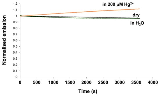 Fluorescence intensity of the sensor probe (in dry state, in H2O, and in a 200 µM Hg2+ solution) as function of time during 60 min of continuous illumination by light from a high power Xe lamp (λex = 375 nm, λem = 440 nm). Fluorescence intensities are normalised to the initial emission of the probe for each data set.