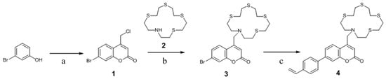 Preparation of mercury sensitive fluorophore styryl (1,4,7,10-tetrathia-13-azacyclopentadecanyl)methyl coumarin (STAMC). (a) Ethyl 4-chloroacetoacetate, H2SO4, H2O, r.t, 22 h, 68%; (b) vinylbenzylchloride, K2CO3, KI, MeCN, 80 °C, 18 h, 69%; (c) CH2=CHC6H4B(OH)2, Pd(PPh3)4, K2CO3, dioxane, 85 °C, 18 h, 52%.