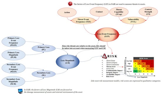 - Primary Loss (PL):PL consists of primary loss event frequency (PLEF) and primary loss magnitude (PLM). PLEF is an element of actions that a threat agent performs on an asset and consists of access, misuse, disclose, modify, and deny access. The intent of the threat agent is largely determined by the motivation (e.g., financial gains, revenge, etc.) and nature of the asset, and the magnitude of the loss depends on the location of the threat agent (outside or inside the organization). PLEF broadcasts threat competence, which is a characteristic that can cause damage. PLM consists of a combination of criticality, cost, and sensitivity. Criticality refers to the nature of assets that causes an impact on the productivity of the organization. Cost indicates the cost of responding to an asset when it is damaged by an attack. Sensitivity refers to the degree of damage that can result from unintended exposure and reflects qualitative measurements such as reputation, competitive advantage, and legal/regulatory proceedings.