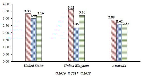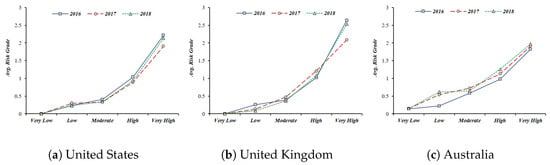 - Primary Loss (PL) to Data Breach in Smart Home: This paper assumes the leakage of sensor data collected from IoT devices in a smart home. In this case, the threat competence constituting the PLEF is the number of leaked data, and PLM is a combination of criticality, cost, and sensitivity, which is a direct economic loss caused by the threat. This PL data is equal to the risk level measured in the “Breach Level Index”. This study collected the data of “Other”, which represents the outflow of general information in the data breach, and used it as an indicator of PL. From 2016 to 2018, we used risk data for information leakage from three countries (United States, United Kingdom, Australia) that suffered the most data leakage (See Figure 6) [66].