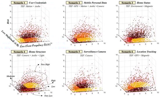 - Threat Event Frequency (TEF) for IoT Devices: TEF is measured by a combination of contact and action. Contact is the frequency with which the threat agent tries to access the asset to be attacked and action is the possibility that the threat agent performs an attack against the attacked object. This study assumes that the contact has occurred because it uses the attack method to deduce the personal information by collecting data about the sensors included in the device. In other words, because there is a limit to obtain permission for various IoT devices, this study reflected the average of the accuracy of other studies when the inference attack was successful (see Table 3). The threat to Scenario 1 is the keystroke inference and eavesdropping that can occur with motion sensors (accelerometer, gravity, gyroscope, and audio sensors.) The threat of Scenario 2 is location inference and eavesdropping, so GPS sensor, motion sensors, It is based on the probability of inference. Scenario 3 occurs at the location reference, which is exposed to threats through environmental sensors and magnetic sensors. Scenario 4 is a threat to understanding the structure of a home, so eavesdropping and task inference attacks are used. This can be represented by a combination of the accuracy of the information inference of camera sensors, light sensors, and audio sensors. Since Scenario 5 is an unauthorised surveillance threat, threats can be quantified by the probability of inference through camera sensors. Scenario 6 is the combination of the inference probabilities of the position sensors with the threat of confirming whether the resident’s home location is located by location inference and task inference.
