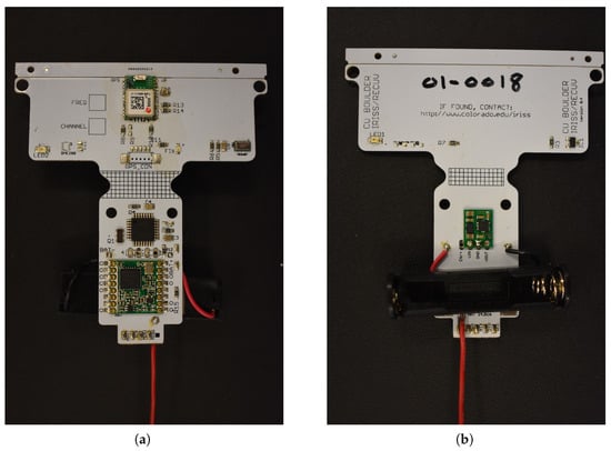 Closeup of the microsonde sensing system. (a) Front side of the microsonde; the GPS module, MCU, and radio module can be seen. (b) Back side of the microsonde; voltage converter and battery holder are shown. Onboard the microsonde are pressure, temperature, and relative humidity (PTH) sensors, a GPS, an MCU, and a transmitter. The sensor board is powered by a 1.5V AAA Lithium battery (not pictured). The microsonde is approximately 8 cm wide and 8.7 cm tall.
