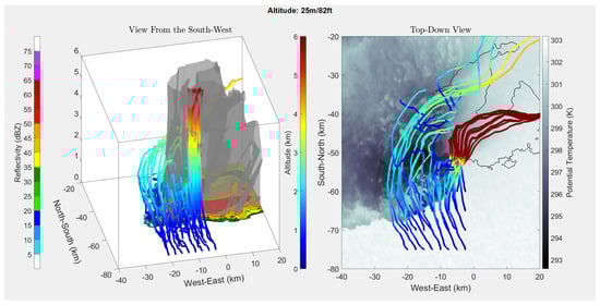 Simulated ALD releases 25 m above ground level, the lowest altitude of the supercell simulation. The colors of the trajectories correspond to the altitude of the drifters in both plots.