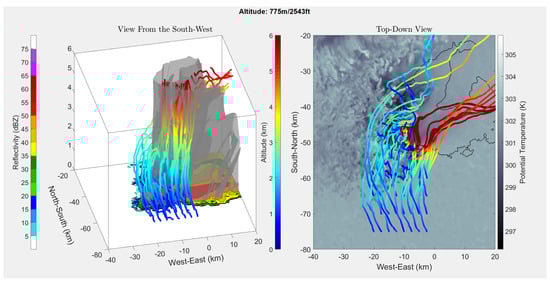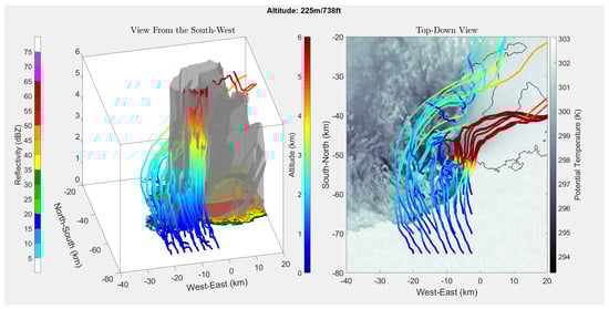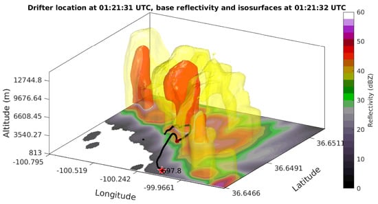 Using a change of variables, Equations (15)–(17) can be rewritten as a system of first-order ordinary differential equations. Integrating with respect to time gives the projected trajectories of the ALDs. Calculations were carried out using the MATLAB ODE23 function. Wind velocity components were extracted from the supercell simulation and input as , , and in Equations (15)–(17). For the current iteration of the trajectory simulation, a search function was implemented to determine the supercell simulation point closest to that of the simulated trajectory. Wind velocity data from these points were dynamically found within the defined parameters of the ODE23 function call.