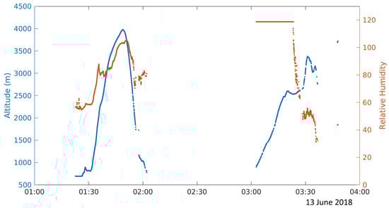 During the 2018 deployment of the Severe-storm Targeted Observation and Robotic Monitoring (STORM) project, a PLD was ground released into a supercell near Gate, Oklahoma. The PLD path through the supercell can be seen in Figure 8. It appeared that the PLD ascended to an altitude of 3.5 km MSL about 30 min after release before dropping back down to the ground where contact with the PLD was temporarily lost. The PLD was likely forced down due to the presence of a downdraft or due to the weight of precipitation. In Figure 9, it can be seen that when communications were reestablished, the relative humidity sensor was saturated. However, after the supercell passed, it is believed that a combination of a decrease in precipitation and increase in temperature caused the PLD to ascend to higher altitudes. It was seen that as the PLD ascended, it turned back towards the direction of storm movement southwards. During the ground release, communications were tested up to a range of 100 km, and the microsonde was able to transmit measurements for a period of two hours.