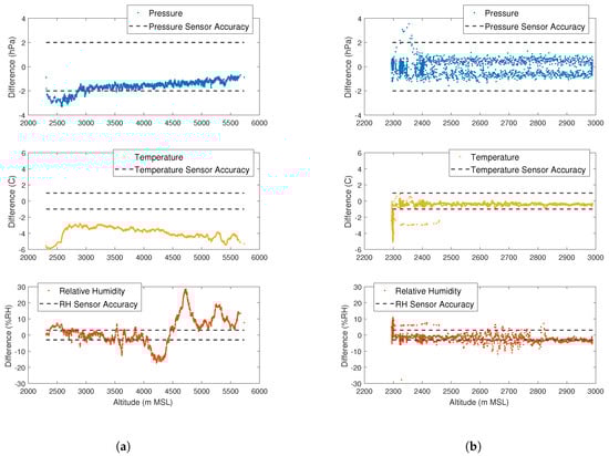 To get a better idea of the microsonde performance, a microsonde was flown next to a Vaisala RS92 under the wing of a Talon fixed-wing, foam-body sUAS. Results from the comparison between the microsonde and RS92 are given in Figure 11b. In this case, the differences between sensors appear to be much smaller throughout the flight. A spike can be seen in the pressure and relative humidity comparison data at the lowest flight altitude, around 2300 m MSL. This spike can be attributed to times prior to take off of the Talon and following landing. Achieving adequate airflow over temperature and relative humidity measurements is an important aspect in collecting accurate results []. It is expected that proper aspiration of both the microsonde and Vaisala RS92 was not attained before takeoff and after landing, when the spike in the comparison occurred. Therefore, work is underway to increase airflow over the sensors to achieve proper aspiration even when operating as a perfect Lagrangian drifter.