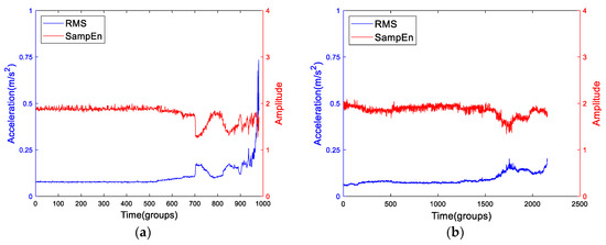 The Intelligent Maintenance System (IMS) Center of the United States has carried out the bearing life test and provided the original vibration signal dataset [5], which are widely used in many references. In this paper, we called this dataset ‘Dataset I’. The details of the dataset we used in the paper are presented in the Appendix A. In Dataset I, the first data of the second test which is named Bearing2-1IMS were the frequently-used public data in many papers [11,12,13,14]. The failure mode of Bearing2-1IMS was outer race fault and the data contains 984 group samples. When we carefully checked the last two group samples, we found both of them were periodic signals. Actually, they did not belong to the run-to-failure data. So, the Bearing2-1IMS data included 982 effective groups. Taking this data as an example, we can plot the RMS and SampEn curves as shown in Figure 1a. Meanwhile, we have plotted the RMS and SampEn of Bearing1-4IMS in which the failure mode was roller element fault as a comparison.