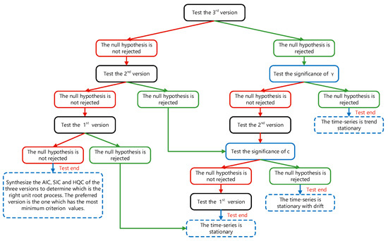 The three versions are tests for a unit root, tests for a unit root with drift and tests for a unit root with drift and deterministic time trend, respectively. When conducting the ADF test, the lag order p should be determined. A good approach is to examine information criteria such as the Schwarz information criterion (SIC), the Akaike information criterion (AIC) and the Hannon–Quinn information criterion (HQC). The flow chart of the ADF test is depicted in Figure 2. More details of the ADF test can be seen in [18,19].
