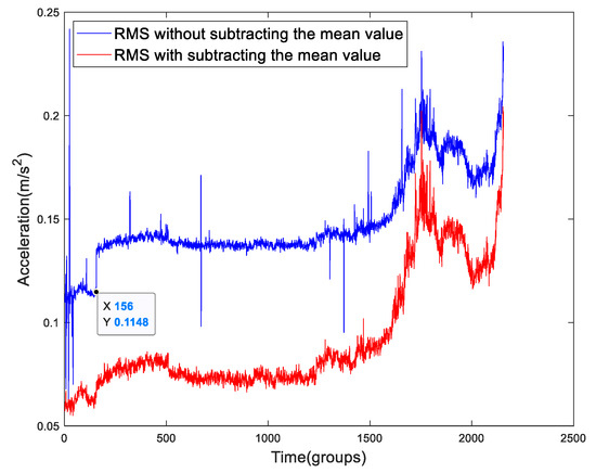 As we can see, in Figure 3a, the mean value is almost zero with a slight fluctuation close to failure. This is a normal phenomenon of the mean value for a run-to failure data. The mean value should be around zero. When the degradation is close to failure, the violent vibration may cause the jitter of the mean value. However, in Figure 3b, there are more fluctuations in the feature, especially a step drop at 156th group. It is an abnormal phenomenon. The values of this time-series are less than zero, which suggests that the sensor may not undertake zero alignment or the bearings and shaft were not properly installed before the test. The degradation feature extracted from the original data will be influenced by the fluctuation particularly a step change of the mean value. To give a better comprehension of the effect of the mean value, a comparison of Bearing1-4IMS’s RMSs with and without mean removal is shown in Figure 4. We can see an inshot at 156th group of the RMS without mean removal. A few of references have neglected this process. For example, in Figure 20 of [11], we can see a step raise at about 120th group that was the cause of the fluctuation of mean value. When we calculated the degradation features in this paper, we subtracted the mean value to eliminate such effects.