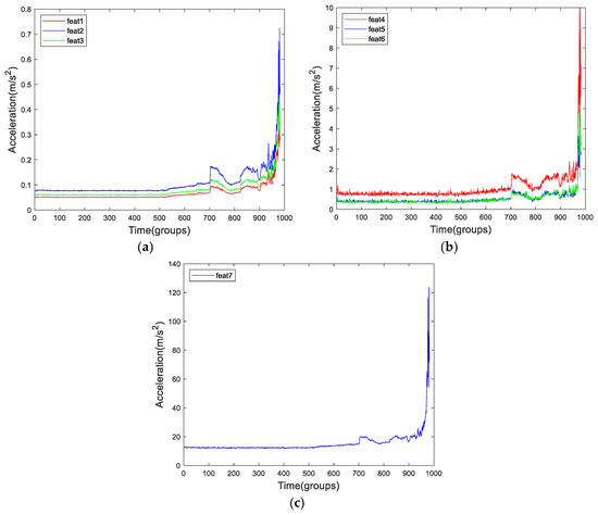 The curves of feat1 to feat7 of Bearing2-1IMS. (a) feat1 to feat3, (b) feat4 to feat6, (c) feat7.