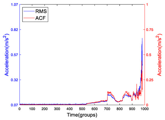 In many references, many signal processing methods have been applied to process the run-to-failure data, e.g., EMD, LMD, VMD, EWT, etc. What these references have in common is that they use many signal processing algorithms to find the defect or characteristic frequency. In a few of references, the authors used the amplitude of characteristic frequency (ACF) as a degradation feature which is shown in Table 1 as feat8. In Figure 6, we plot the frequency spectrum of the 700th group of Bearing2-1IMS demodulated by Hilbert transformation (HT). As it shows, the outer race defect which values 230.7 Hz is obvious, and its amplitude is 0.04647 m/s2. Then we extract every characteristic amplitude of each group of the signals demodulated by HT to form the ACF as shown in Figure 7 compared with RMS. We can see that there is a similarity between both, but at the end of failure, the growth rate of ACF is not as fast as RMS. For ACF, it just measures the variation trend of the amplitude of fundamental defect frequency of the run-to-failure data. For RMS, it measures the average amplitude of each group. As Figure 6 shows, the spectrum exists septuple frequency at least which means that the fundamental frequency is not all the defect frequencies. Moreover, the bearing’s defect not only includes pitting or dent but also wear or abrasion. The wear may not generate defect frequency. Nevertheless, it is an important component of bearings’ degradation which cannot be ignored. So, the ACF could not reflect the holistic bearings’ degradation process correctly.