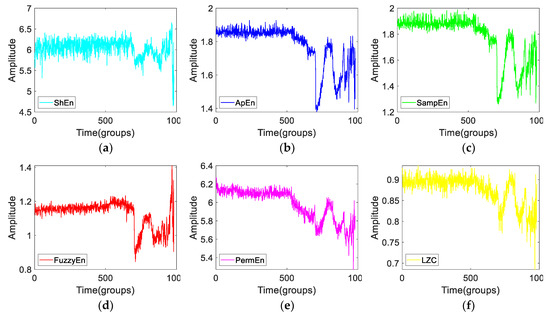 The six complexity features of Bearing2-1IMS. (a) ShEn, (b) ApEn, (c) SampEn, (d) FuzzyEn, (e) PermEn, (f) LZC.