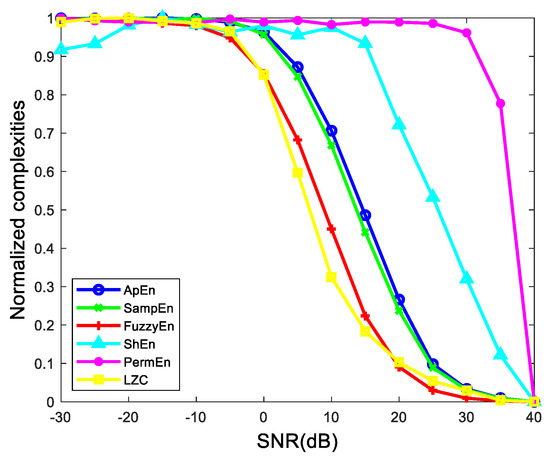 To test the performance of complexities, the first thought is to test in periodical signals with different intensity noise. And we give a group of simulation signals, , where and is the additive white noise. The sampling frequency is 10,000 Hz with 1 s duration. Figure 9 shows the complexities with different SNRs. For convenience, all the complexities have been normalized.