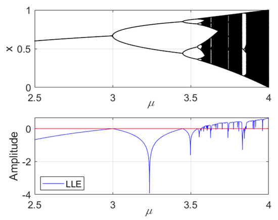 In above, we have discussed the performance of the six complexities in a group of simulation signals. In this part, we are going to use more general simulation signals. Thus, the logistic map was taken as an example, since it can generate periodical and chaotic signals. As many references shown, rolling bearings are highly nonlinear components and many studies have reported nonlinear phenomena such as bifurcations, quasi-periodicity, and chaos in rolling element bearings [28,29,30]. Logistic map, as is well known, is a nonlinear dynamic system, where a simple mathematical model is used to describe the change of insect quantity with time increasing. Logistic map can be written as . Figure 10 shows the bifurcate evolutional process of the logistic map where , meanwhile, Figure 10 shows the largest Lyapunov exponent (LLE) of the logistic map. Where LLE < 0 means the system is periodical. LLE = 0 means bifurcation occurs; and LLE > 0 means chaotic behaviors occur. As is known, the period 2 bifurcation occurs at ; the 4 bifurcation occurs at . After , there is a short period 3.