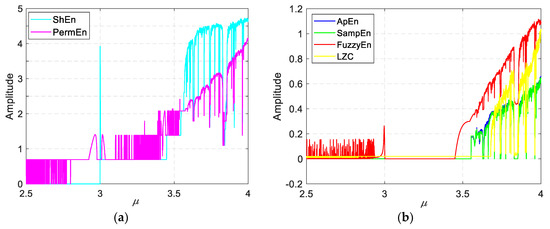 The six complexities of the logistic map. (a) ShEn and PermEn, (b) ApEn, SampEn, FuzzyEn and LZC.