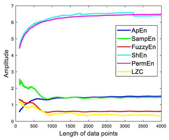 The complexities are also affected by the length of data. It is inaccurate to use the data which the complexities are not convergent. So, to make clear the performance in rate of convergence are another comparison of complexities. Taking a sinewave signal with −10 dB addictive white noise as a case, the complexities values are calculated from the length 100 to 4000 as illustrated in Figure 12. The PermEn and ShEn have similar increasing convergence trend, since the core operation of PermEn is ShEn. And the complexities values are convergent after 2000 data points. SampEn, FuzzyEn, LZC have similar convergence trend. The complexities values have a fluctuant decreasing trend. ApEn is different from the above, and it has a fluctuant increasing trend. From the comparison of convergence rate, we can confirm that ShEn and PermEn are no doubt the worst.