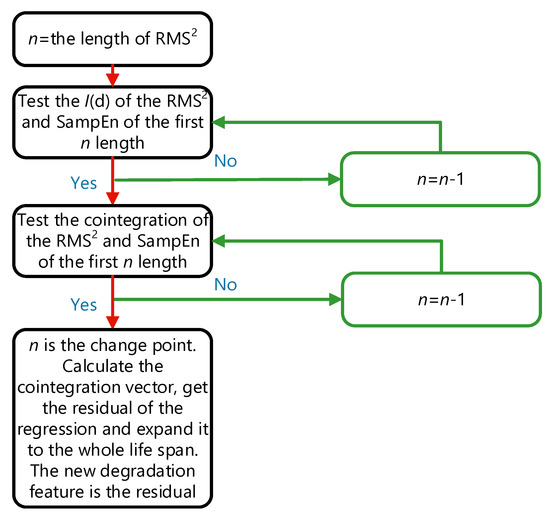 First, we have to confirm that the squares of the energy features represent the energy. And we define the term RMS2 as the square of the RMS. By using the ADF test, we found that the RMS2 is , but SampEn is . However, the basic requirement of cointegration where the order of integration of two time-series should be the same has not been met. Next, we can gradually reduce the length of RMS2 and SampEn by removing the last point and check the order of integration of the two truncated features. The iteration is stopped once the two truncated features satisfy that they have a cointegration relationship at a given significance level (e.g., 0.1). The stop point n is defined as the change point. In this example, the change point is 914. The proposed health indicator is the extend residual of the cointegration regression. Figure 13 shows the flow chart of extraction of the new health indicator. Figure 14 shows the RMS2, the SampEn and the new health indicator of Bearing2-1IMS.