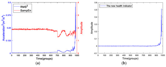 (a) The RMS2 and SampEn curves of Bearing2-1IMS and (b) the new health indicator.