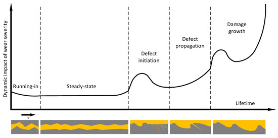 The degradation process of rolling bearings is complex. In fact, the degradation of rolling bearings is an evolution of wear. El-Thalji and Jantunen have built a descriptive model of wear evolution [31,32]. Figure 15 shows the descriptive model which has five-stage scenario, namely running-in, steady-state, defect initiation, defect propagation, and defect growth. It can help to have a quick review of the evolution of the degradation of wear.