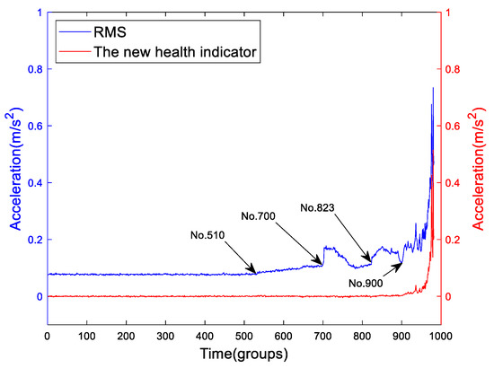 The wear evolution is a nonlinear process. The RMS can represent the average energy of bearings which can also reflect the wear evolution indirectly. For convenience, we put the RMS and the new health indicator of Bearing2-1IMS together as shown in Figure 16. The running stage of Bearing2-1IMS is inconspicuous or almost non-existent. Before 510th group, the RMS stays steady. From 510th to 700th groups, the RMS is linear, which means the asperities on the interaction surface are becoming more and increasing in size. The 700th group is a transition point. At this point, the RMS experiences a mutation which probably indicates that the crack is opened. From the 700th to 823th groups, the first “healing” process occurrs. In this stage, the defect is propagating. From 823th to 900th groups, the RMS experiences the second visible “healing” process. The 900th point is the minimum point of the second “healing” process. From the 900th to the end, the RMS grows quickly with fluctuation. It can be seen that the RMS of Bearing2-1IMS is good reflection of the descriptive model proposed by El-Thalji and Jantunen.