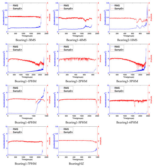 Among the aforementioned reviews, there are two degradation features which have been referred to, one is the energy features, the other is the complexity features, where the root mean square (RMS) and the Sample Entropy (SampEn) are two representatives. To show the fact that different run-to-failure data of bearings do not have a unified degradation trend, an example is presented below.