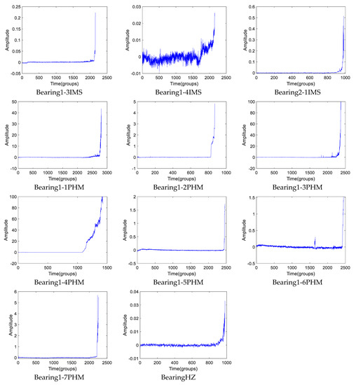 By cointegration, the new health indicators of the eleven data are extracted, which are shown in Figure 18. As we can see, each proposed health indicator shows distinct “two-stage” character, the zero-line stage and quickly raise stage. Take a look at the results of Bearing1-3IMS of Figure 17 and Figure 18, we can see that there is an inshot at the 156th point of the RMS and a slight uplift of its new health indicator. By checking the raw data of IMS Dataset I, we can find that the experiment is not continuously operating, the test is discontinuous, and the 156th is an interrupting point. The condition of the test may have changed at such point. It gives us an enlightenment that the run-to-failure test should be continuously completed. Shutdown or discontinuous operation may change the authenticity of data. There is more noise in the results of Bearing1-4IMS and BearingHZ. It is appropriate to use denoising methods before or after the fuse process.
