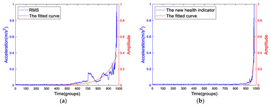 The features should be normalized. By using the exponential fitting method, the fitted curves of Bearing2-1IMS are shown in Figure 19. It is easy to see that the proposed health indicator is more suitable for the exponential model. The SSE, R-square and RMSE of the RMS’ fitting are 2.228, 0.706 and 0.04768. The result of the proposed health indicators are 0.7078, 0.7655 and 0.02687. So, the result of the proposed health indicator is better, which means that the exponential degradation model is more suitable for the proposed indicator than RMS.
