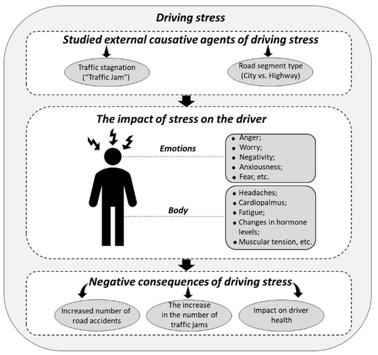- Dwight, A.H.; David, L.W. The relationship between traffic congestion, driver stress and direct versus indirect coping behaviours. Ergonomics 1997, 40, 348–361. [Google Scholar]
