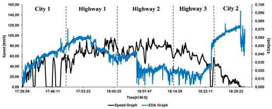 Two methods of driving stress evaluation were studied and compared: Dependency between stress and road traffic, and between stress and road type. The vehicle speed and the driver’s EDA signals were recorded for different road segments such as city and highway driving as shown in Figure 3.
