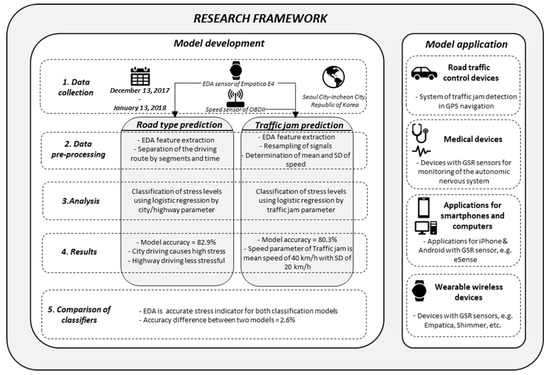 Logistic regression analyses were performed, by using IBM SPSS Statistics Version 23 Software, on every traffic conditions and different road types. Figure 5 contains the schematic description of the development process for both models and their application areas. The physiological features of EDA (OD and OM) and OBD-II data (vehicle speed) were used to construct the same framework in this study. In particular, the model development section of Figure 5 summarizes the study in detail, which is designed to identify the abstract content shown in Figure 1.