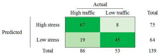 The goodness of model fit measure evaluates the ability of developed models to explain variation in the dependent variable (high and low stress). As such measures, pseudo-R-squared are usually used in logistic regression analysis. In the presented study pseudo-R-squared of Cox and Snell and Nagelkerke were obtained using IBM SPSS Statistics Software (Version 23). For traffic condition model Cox and Snell and Nagelkerke R-squares are 0.323 and 0.432 respectively. Figure 6 shows the confusion matrix of the analyzed datasets for the classification of high and low stress levels by using the EDA data, depending on the traffic conditions.