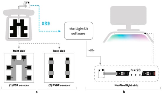 The technical implementation of the LightSit system. (a) A seat pad equipped with (1) six FSR sensors and (2) two PVDF sensors. (b) A flexible light strip that can be used as an ambient display.