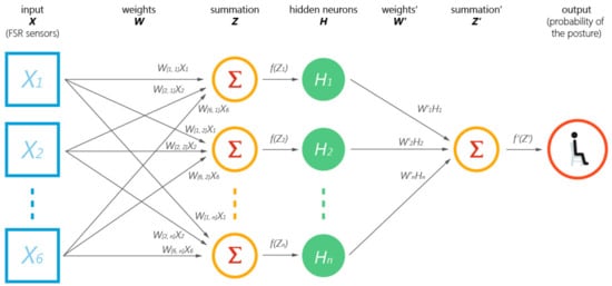 Based on the hardware implementation, we used the data collected from the six FSRs to recognize a user’s sitting postures and variances. Zemp and colleagues [] demonstrated the feasibility of using various machine learning approaches to classify sitting postures based on data from multiple pressure sensors on the seat pan. Similarly, in this study, a specialized artificial neural network (ANN) was applied to process the sensory data from FSRs for detecting different sitting behaviors of the user. In the LightSit system, we applied a conventional three-layer (an input layer, a hidden layer, an output layer) feedforward network using the Levenberg–Marquardt algorithm, which has been widely applied and validated in a variety of ANN applications, such as greywater treatment [], skin lesion analysis [], posture classification [], etc.