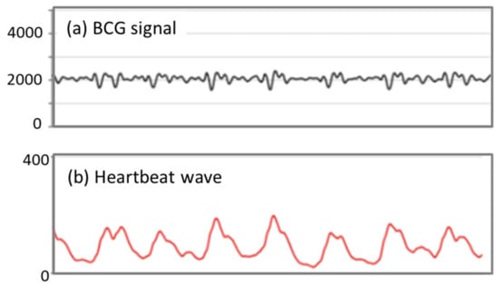 (a) Raw ballistocardiography (BCG) signals from an electromechanical film sensor (EMFi), and (b) a heartbeat wave extracted by the mean absolute deviation (MAD) algorithm from the BCG signal.