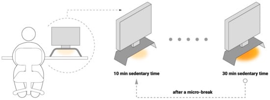 It has been proven that, during busy work, even a short one-minute break (namely, a microbreak) with self-regulated healthful behaviors can benefit an individual’s physical and mental well-being []. A number of studies have indicated that a short bout of relaxation at the desk during office work can boost the productivity of employees []. In this project, we explored a new interventional strategy through LightSit, which facilitates office workers in doing lower back stretching and deep breathing during microbreaks at a desk and habituates such healthy breaks through repeated exercises in a work routine. We identified a typical scenario for LightSit-enabled breaks: “Gain awareness of unhealthy behaviors during work. Then commit some low-effort desk exercises through self-regulation (e.g., stretching, deep breathing) without leaving the ongoing work.”