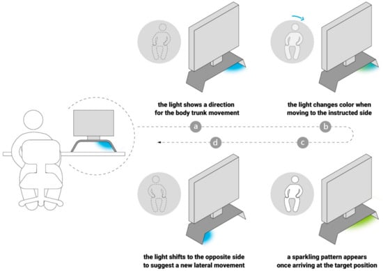 As shown in Figure 6, LightSit facilitates a lower back stretching exercise, which was adapted from dynamic weight shifting []. Specifically, dynamic weight shifting involves slow trunk movements on the pelvis to shift body weight laterally, with a few seconds of stretch hold on each side. As mentioned earlier, musculoskeletal back pain is one of the most critical occupational health issues []. Lower back stretching has been evaluated in many other studies as an effective desk exercise in preventing lower back pain for office workers [,] (as well as in our earlier work []).