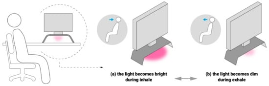 As shown in Figure 8, when the system recognizes the user sitting still and the HRV increasing rapidly due to slow breathing, LightSit starts providing HRV biofeedback, in which the intensity of the light is directly mapped to real-time heartbeat interval data. HRV biofeedback has been widely documented as an effective tool in mitigating stress and promoting relaxation [,,,]. In this case, the lighting display serves as an interface for an HRV biofeedback [] system that shows respiratory sinus arrhythmia. When coupled with heartbeat interval (IBI) data, the light brightness increases and decreases in response to a user’s breathing. Specifically, we mapped IBI data (from 550 to 1150 ms) to the brightness of the light (10 to 255) so that the light becomes bright during inhalation (see Figure 8a) and becomes dim during exhalation (see Figure 8b). This immediate feedback can help the individual better focus on breathing regulation and achieve a smooth and deep breathing pattern. The user can set up a light color that makes them feel relaxed. The LightSit system calculates the user’s HRV40 and maps it to a saturation value ranging from 10 to 250. Thus, a highly saturated colored light represents an improved HRV, which indicates a healthy benefit from slow breathing.
