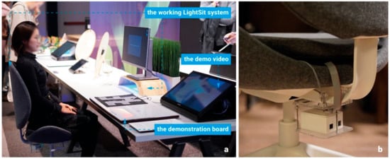 During the exhibition, we invited visitors to LightSit to experience the prototype and share their opinions on using the system (in a short follow-up interview). This study did not involve the collection of any physiological data and medical data. During recruiting, we fully informed participants about the procedure of the study and got their consent to take notes on observations of the experience session and the interview. The participants for whom it might have been risky to perform the stretching and deep breathing exercises were excluded. They were also given the opportunity to withdraw at any point. As the study was conducted at an exhibition based on a showroom approach [], we did not manage to collect participants’ information, such as age and gender. During this eight-day showroom-based study, more than 500 participants tried out the LightSit system. We interviewed 50 participants who had an office-based job just after their experience with LightSit.