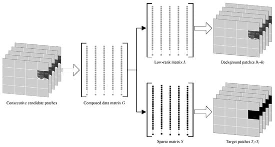 Along with continuously captured scene images of the imaging system, a group of consecutive candidate patches extracted form several adjacent images is designated and vectorized as columns to compose a data matrix , where d is the total number of pixels in each candidate patch, and l is the number of adjacent images. Making use of the characteristics of background scene slight change and target relative salient movement within a finite time period, the data matrix G will be decomposed to a low-rank matrix L and a sparse matrix S via robust principal component analysis (RPCA) [37,38], where the low-rank matrix L can be regard as a composition of the separated background patches , and the sparse matrix S can be regard as a composition of the separated target patches , as shown in Figure 2.