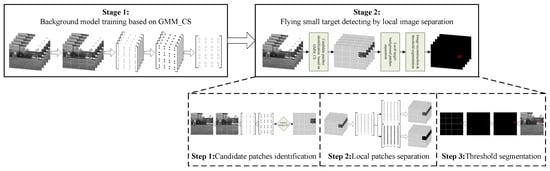 Based on the aforementioned discussion, a new approach to flying small target detection for anti-UAV based on a Gaussian mixture model in a compressive sensing domain is designed. The approach includes two operation stages: background model training and flying small target detecting, in which the flying small target detecting stage is composed by three process parts: candidate patches identification, local foreground–background image separation and threshold segmentation over reconstructed sparse images. The comprehensive scheme of the proposed approach is depicted in Figure 3.