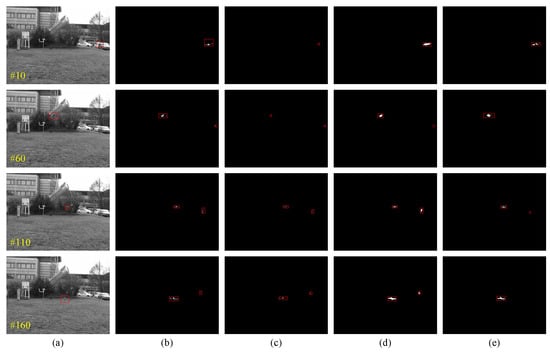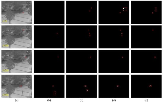 Some experiment results of flying small target detection on infrared image sequence obtained from different algorithms (a) groundtruth, (b) GMMv1, (c) GRASTA, (d) DECOLOR and (e) the proposed method.