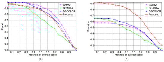 Consequently, the recall and precision are statistically calculated over the whole infrared small target sequences. The thresholds of overlap score for target success detection affirmation are choose from 0.05 to 1 with step 0.05, and the resultant curves are plotted in Figure 7. It is easy to observed that the proposed method has better recall and precision evaluation when the thresholds of overlap score is less than 0.45, and has similar recall and precision evaluation when the thresholds of overlap score is more than 0.45.
