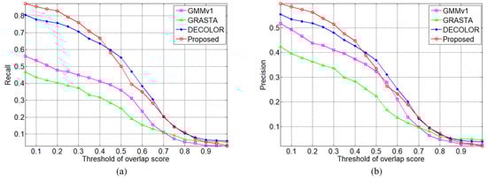 Curves of recall and precision with different threshold of overlap scores for flying small target detection on visible image sequence (a) recall and (b) precision.