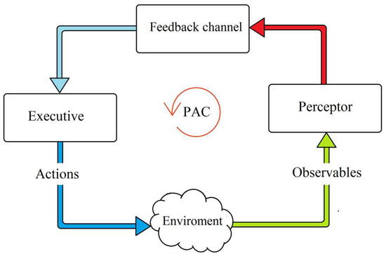 The PAC is a basic principle of cognition (Figure 1) [6]. Inspired by neuroscience and the human brain, the PAC is the cybernetic information-processing loop that helps the living organism to adapt dynamically to its environment (e.g., the environment can be the transmission medium in a fiber optic link) by aim-directed behavior or language [6]. In these activities, the CDS functions like the human brain and processes the measured information from sensors [7]. In Figure 2, the basic description of the CDS is shown. This figure gives us a better insight into how the PAC functions in the form of a global feedback loop. The PAC includes the perceptor and the executive. In addition, a feedback channel links them together, and the environment closes the feedback loop. The most important parts of PAC are the following.