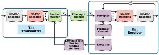 Here, applications of the CDS to the fiber optic link is presented. Figure 5 shows the block diagram of a fiber optic system with CDS. The executive, the perceptor, and the feedback channel are placed in the receiver (Rx), and the executive sends actions such as new launch power to the fiber optic link by low data rate link to the transmitter (Tx). In Figure 6, and are received and transmitted symbols, respectively, and is the received symbols after forward error correction (FEC). Moreover, Figure 6 and Figure 7 shows the block diagram of the proposed CDS in this paper. In addition, we describe the blocks in Figure 7 in Section 3.1, Section 3.2 and Section 3.3 for the perceptor, feedback channels, and executive respectively.