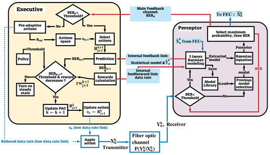 The subsystems of the executive shown in Figure 7 are explained as follows. If the BER exceeds the FEC threshold, the executive runs pre-adaptive actions such as data rate reduction and sending the updated reference data rate to the actions space. If the BER is less than FEC threshold, the executive selects an action from the actions space. Here, the action is the data rate enhancement. The block “prediction” in the executive predicts the BERk+1 based on the statistical model received from the preceptor through the internal feedback link (see Equation (7) and Equation (8)). The block “rewards calculation” computes the internal reward using the predicted BER and a prospective data rate of and Equation (4). If the predicted BER is below the FEC threshold and a lower value of the internal reward is achieved, then the executive interprets that the system is performing well with , and the data rate can be enhanced further. The new (prospective) data rate is communicated to the transmitter using a low data rate link. Otherwise, the executive turns on the steady state mode, and assumes is the best possible data rate that can be achieved for the current fiber optic link.