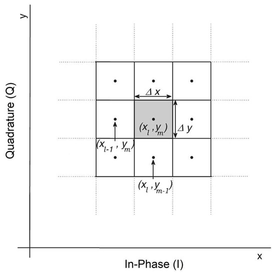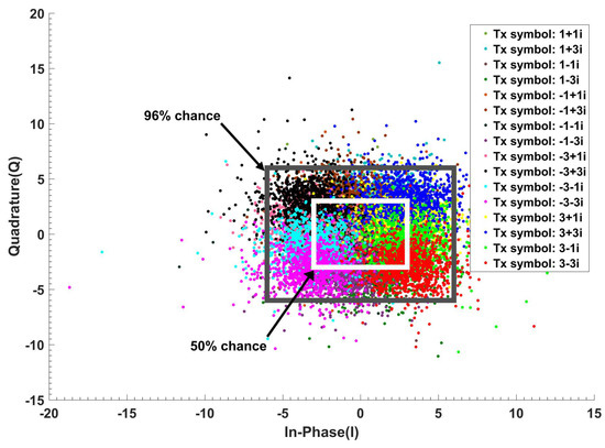 Figure 9 shows the in-phase (I) and quadrature (Q) of the received data . We define 96% probability box (or 99% probability box depending on the application), which means that 96% of the received data is inside this box when QAM-16 data is sent. In addition, the system maps and normalizes all receiving symbols outside of this box to its borders. For example, if the received symbols is 8 + 9j, then it is mapped to 6 + 6j when the 96% box is used. The normalized data (i.e., 6 + 6j in this example) is sent to Layer II (Figure 8) for further processing. The BER is used to adaptively select the borders of the probabilistic box. For lower computational cost and faster modeling, a probability box with smaller area is better. For example, the computational cost associated with the 90% probabilistic box is a lower than the 99% probabilistic box. However, this leads to inaccurate results and higher BER. Therefore, the BER is used as a feedback to choose the optimum probability box for which the computational cost is lower with acceptable high accuracy (in this example, it is 96% probabilistic box, see Figure 9).